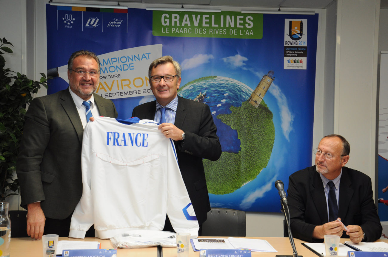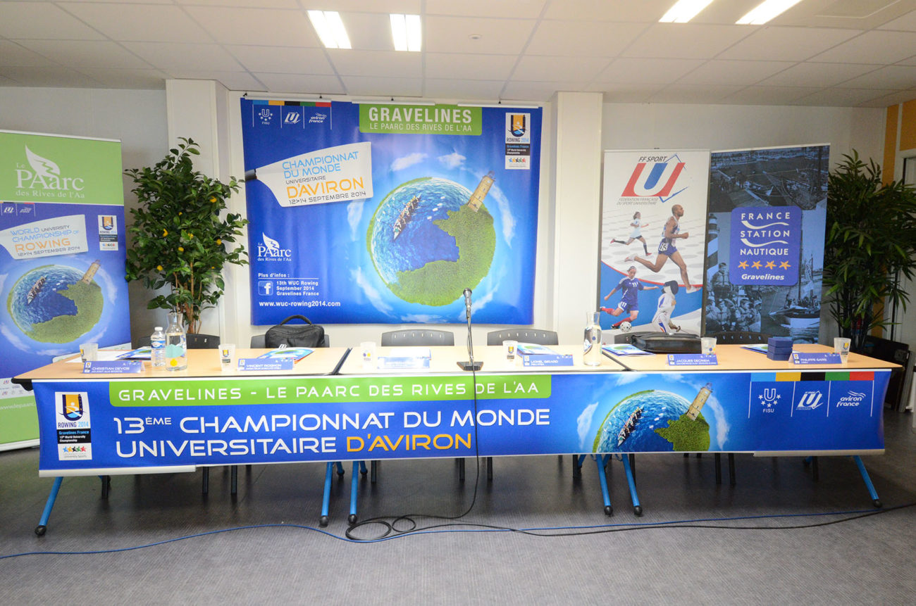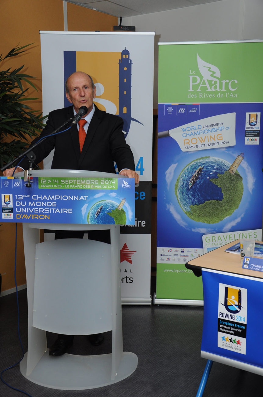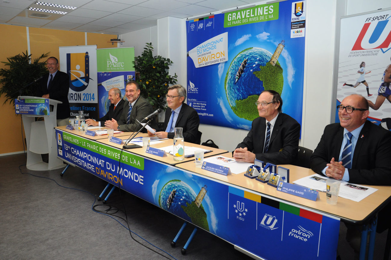Devant un parterre de médias, les différentes personnalités se sont relayées à la tribune, pour présenter ce Championnat qui s’apprête à battre plusieurs records : celui des pays engagés (34) et celui du nombre d’athlètes participants (500). Christian Devos (Adjoint au maire de Gravelines chargé des sports), Vincent Rognon (Directeur national FFSU), Philippe Gars (Directeur exécutif du Championnat), Lionel Girard (Délégué technique FISU), Jacques Decriem (Président de la Ligue Nord Pas de Calais d’aviron) et Betrand Ringot (Maire de Gravelines et ancien champion de France… d’aviron!) ont souligné la qualité du travail fourni, depuis deux ans, par le Comité d’organisation, et insisté tour à tour sur la parfaite synergie entre les différents partenaires : Fédérations (FFSU, FFA, FISU), Ligues (CRSU, Ligue d’aviron), Collectivités territoriales (Conseil Régional Nord Pas de Calais, Conseil Général du Nord, Communauté Urbaine de Dunkerque, Sivom des Rives de l’Aa) Ville et club d’aviron de Gravelines, tous totalement investis dans ce projet d’envergure.