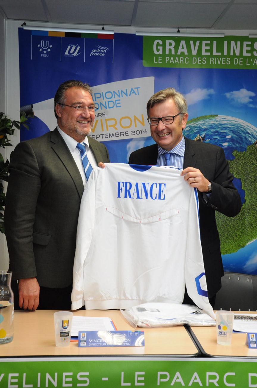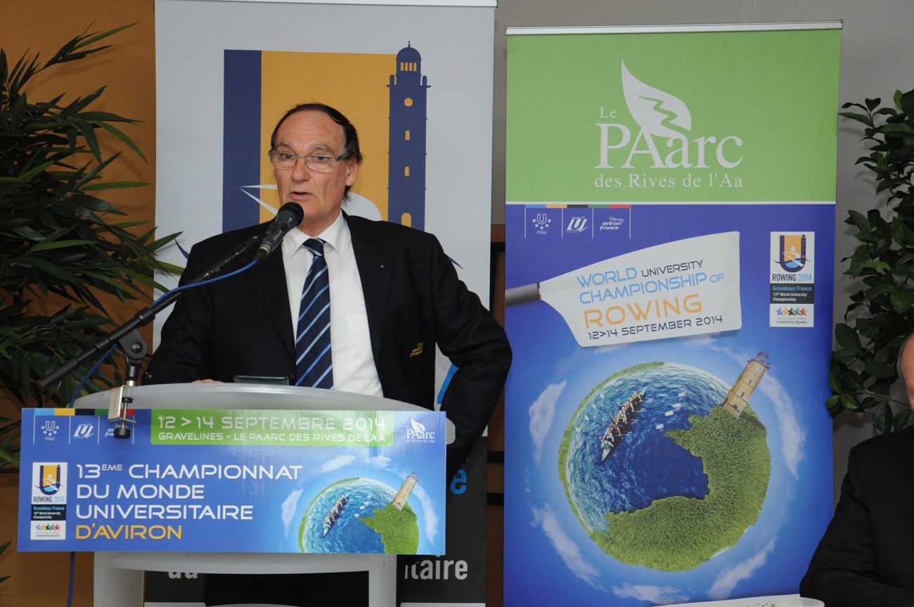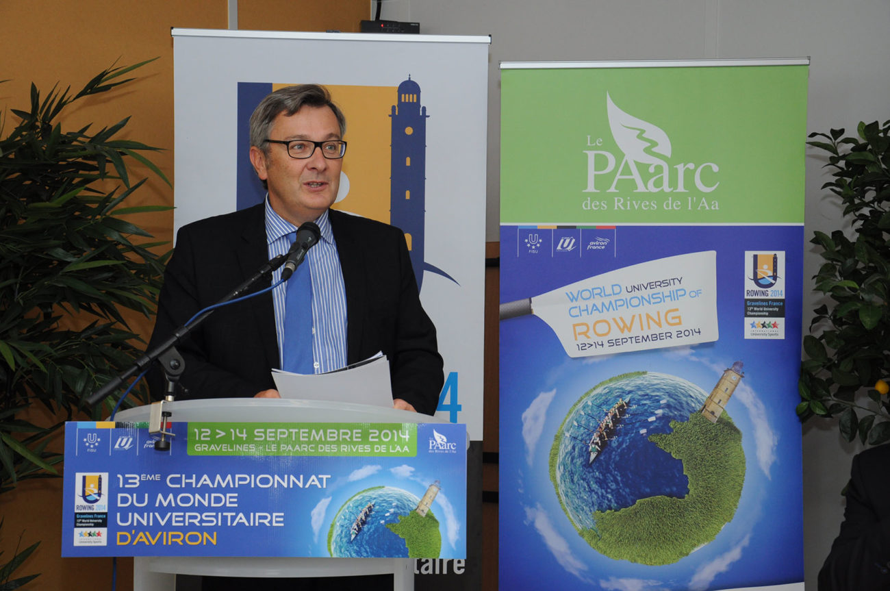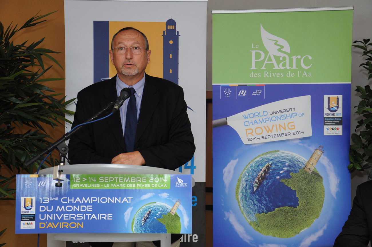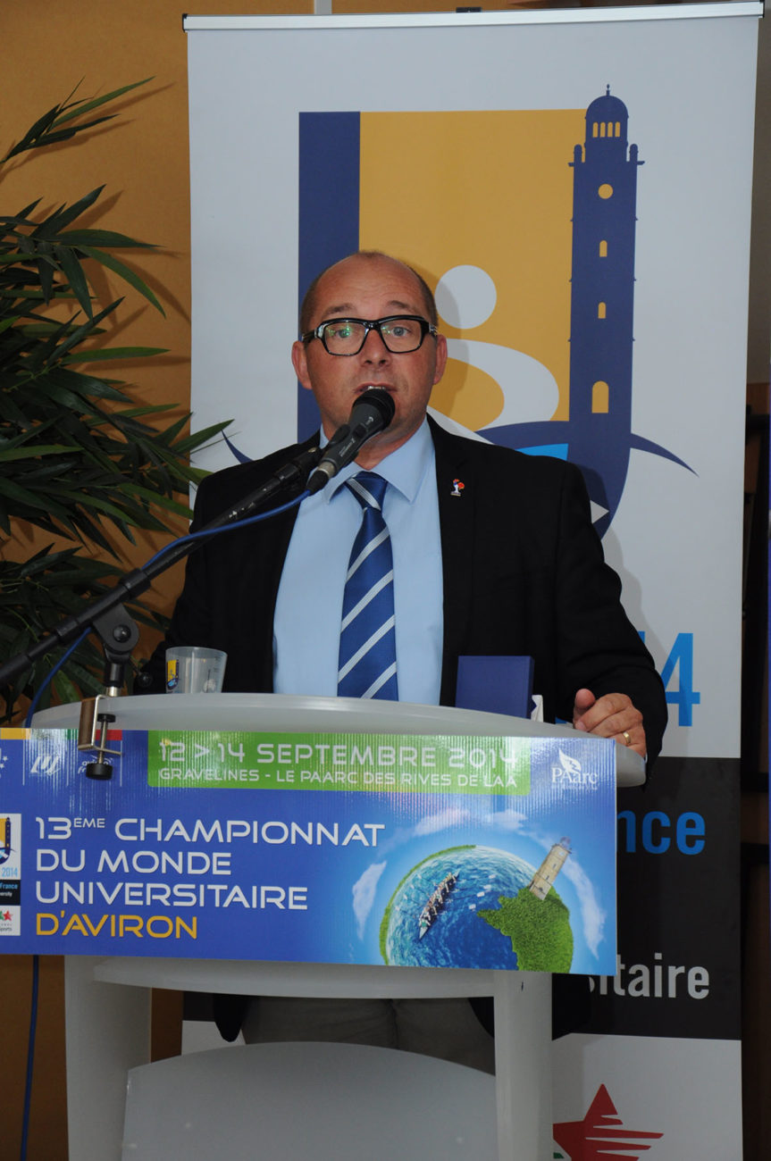 Devant un parterre de médias, les différentes personnalités se sont relayées à la tribune, pour présenter ce Championnat qui s’apprête à battre plusieurs records : celui des pays engagés (34) et celui du nombre d’athlètes participants (500). Christian Devos (Adjoint au maire de Gravelines chargé des sports), Vincent Rognon (Directeur national FFSU), Philippe Gars (Directeur exécutif du Championnat), Lionel Girard (Délégué technique FISU), Jacques Decriem (Président de la Ligue Nord Pas de Calais d’aviron) et Betrand Ringot (Maire de Gravelines et ancien champion de France… d’aviron!) ont souligné la qualité du travail fourni, depuis deux ans, par le Comité d’organisation, et insisté tour à tour sur la parfaite synergie entre les différents partenaires : Fédérations (FFSU, FFA, FISU), Ligues (CRSU, Ligue d’aviron), Collectivités territoriales (Conseil Régional Nord Pas de Calais, Conseil Général du Nord, Communauté Urbaine de Dunkerque, Sivom des Rives de l’Aa) Ville et club d’aviron de Gravelines, tous totalement investis dans ce projet d’envergure.