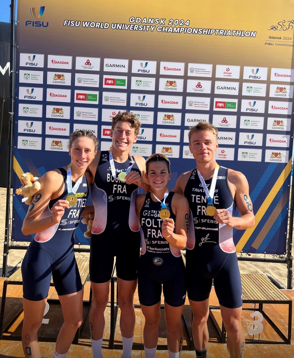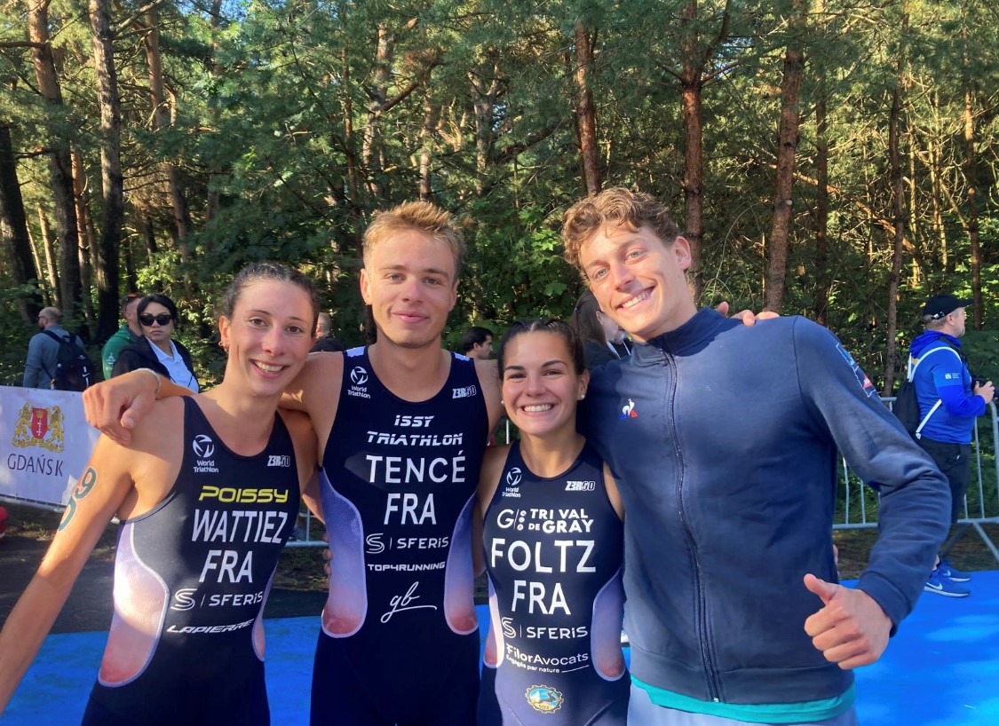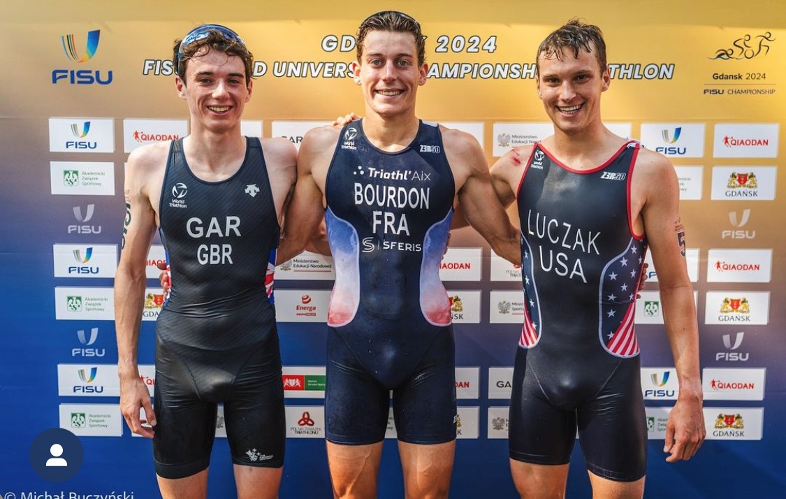 A Gdansk (Pologne), les triathlètes tricolores ont conquis deux superbes médailles d’or : Enzo Bourdon (EDHEC Business School) en individuel et le relais mixte composé, par ordre d’apparition, d’Enzo Bourdon, Appoline Foltz (Université Montpellier), Briac Tencé (Université Grenoble Alpes) et Marie Wattiez (Université Rennes 2) !