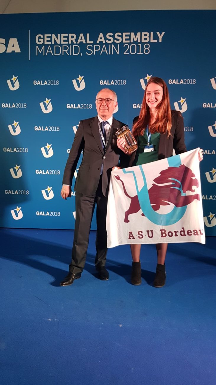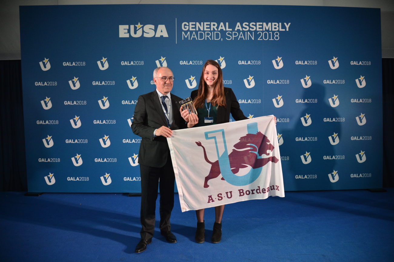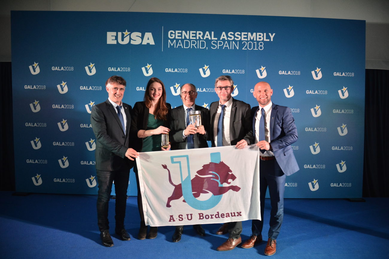Jeudi 13 avril, lors de l’Assemblée Générale de l’Association Européenne du Sport Universitaire (EUSA) à Madrid, l’Université de Bordeaux a reçu le Trophée de meilleure Université Sportive d’Europe!