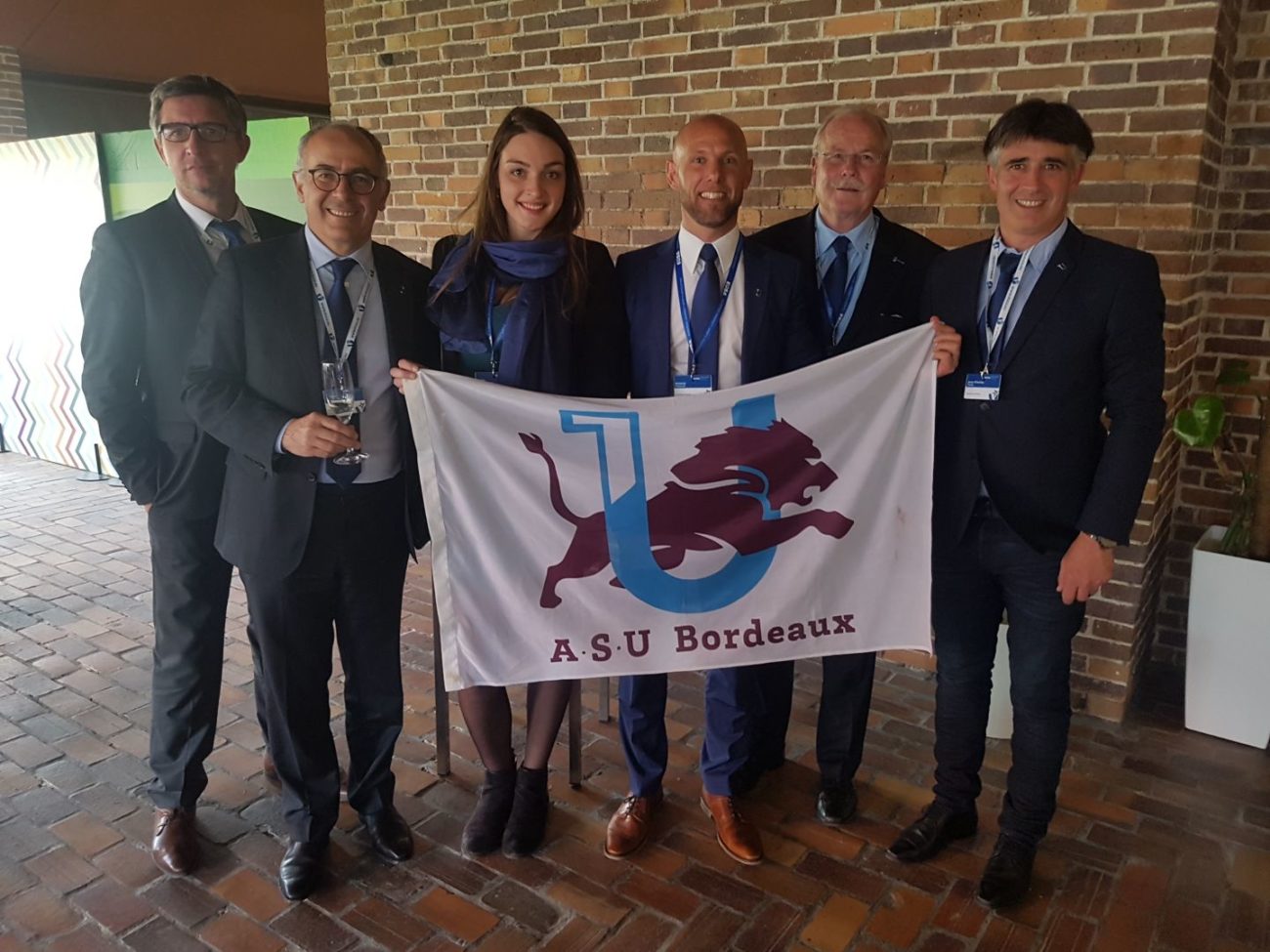 De g. à d. : Olivier Lavialle (Président de la Ligue Nouvelle-Aquitaine du Sport Universitaire), Manuel Tunon de Lara (Président de l’Université de Bordeaux), Laure Desreumaux (joueuse de l’équipe de volley-ball de l’Université de Bordeaux, vice-championne d’Europe universitaire 2017), Amaury Delerue (Président de l’Association Sportive de l’Université de Bordeaux, enseignant EPS et arbitre international FIFA de football), Jean-François Sautereau (Président de la Fédération Française du Sport Universitaire) et Jean-Charles Astier (enseignant EPS au SUAPS et ex-Président de l’Association Sportive de l’Université de Bordeaux)
