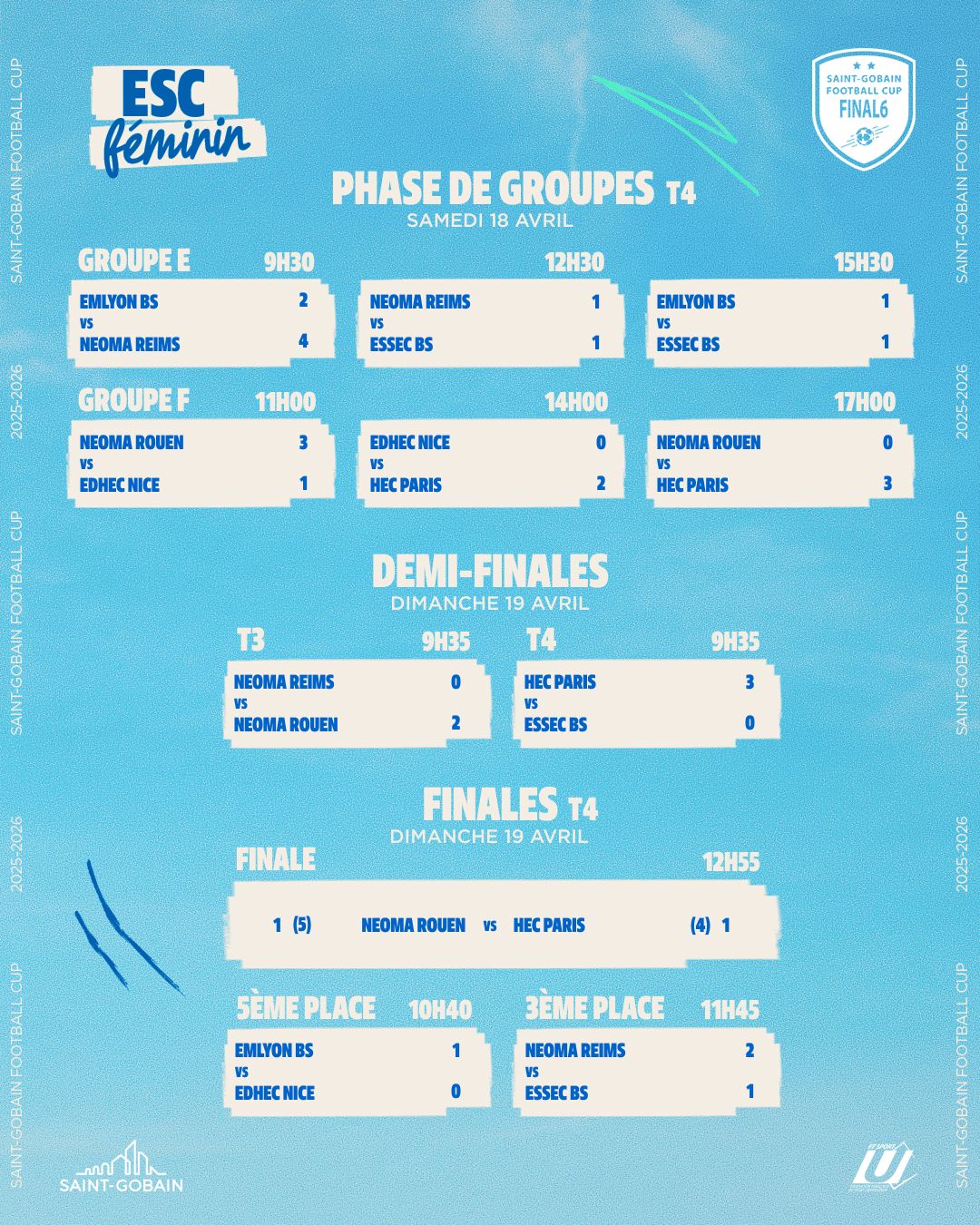 | ST GOBAIN FOOTBALL CUP Féminine Cadrage Sportif Règlement | Tour 1 : 25/26 nov 2023 Tour 2 : 03/04 fév 2024 Tour 3 : 02/03 mars 2024 | Poules Suivi des résultats Résultats Barrages Chasse sur Rhône Résultats Barrages Saclay | ESC Résultats Féminins 2024 | |