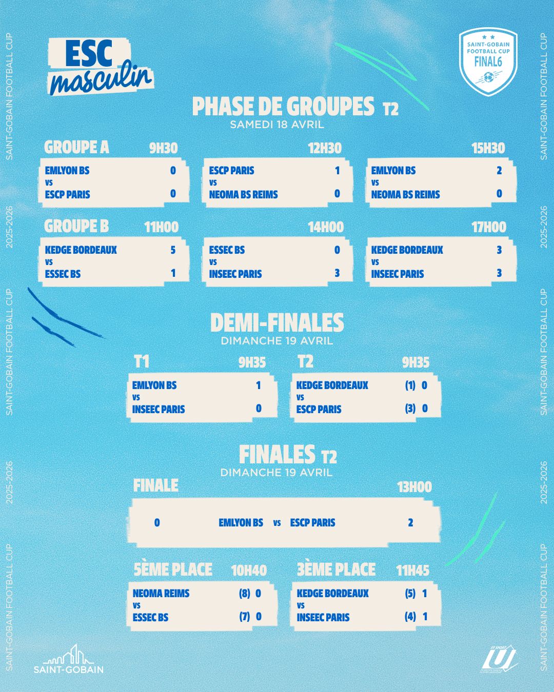 | ST GOBAIN FOOTBALL CUP Masculine Cadrage Sportif Règlement | Tour 1 : 02/03 dec 2023 Tour 2 : 10/11 fev 2024 Tour 3 : 09/10 mars 2024 | Poules Suivi des résultats Résultats Barrages Chasse sur Rhône Résultats Barrages Saclay | ESC Résultats Masculins 2024 |